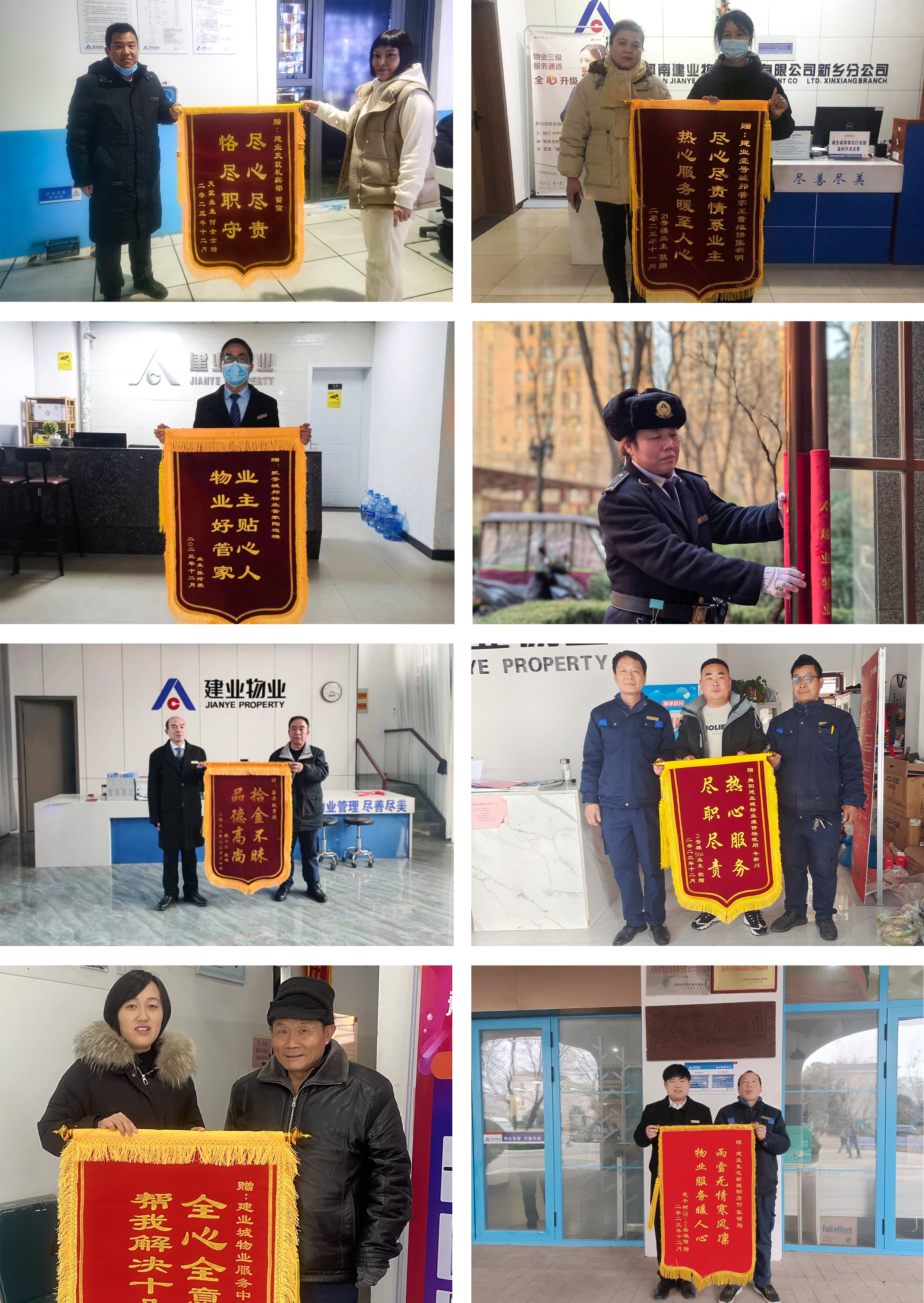 12月份,建業(yè)物業(yè)在管園區(qū)涌現(xiàn)出好人好事857件,其中收到錦旗231面、感謝信88封,其他致電表?yè)P(yáng)等533次。