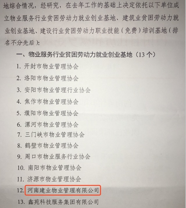 建業(yè)物業(yè)被評選為“物業(yè)服務(wù)行業(yè)貧困勞動(dòng)力就業(yè)創(chuàng)業(yè)基地”