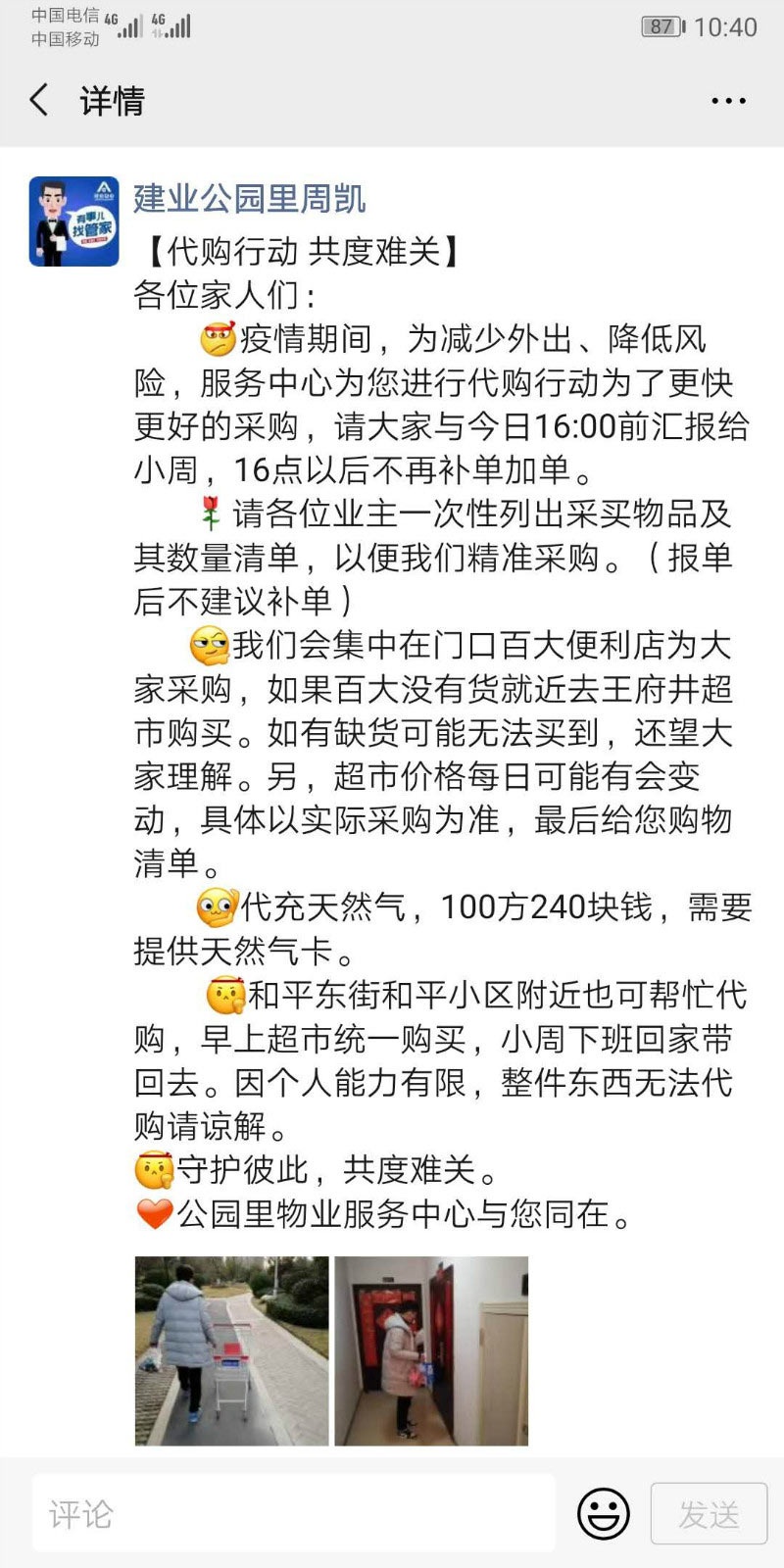 平輿建業(yè)城是一個剛交房三個月的新小區(qū),雖然入住率極低,但本著“服務(wù)標(biāo)準(zhǔn)不能低”的準(zhǔn)則,毅然在全市范圍內(nèi)啟動了生活物資代購服務(wù)。