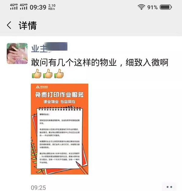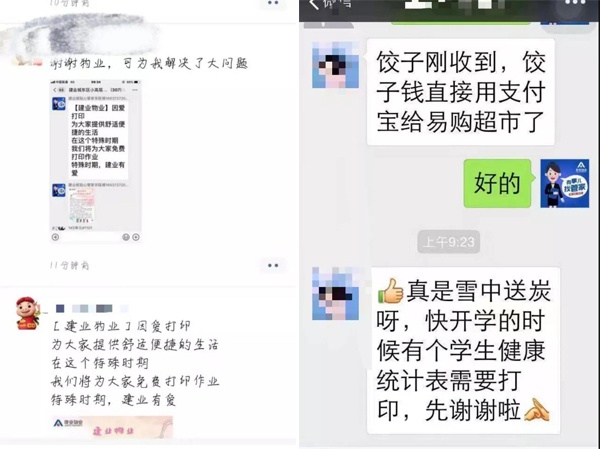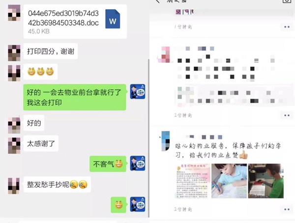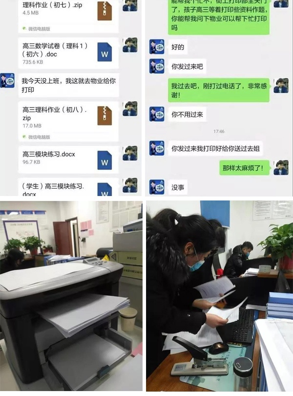 “這項(xiàng)服務(wù)就是及時(shí)雨,就是雪中送炭!外面打印店都沒開門,建業(yè)物業(yè)真的幫我們解決了一大難題?!?br />   “建業(yè)物業(yè)的這個(gè)措施太棒了!孩子的作業(yè)多,手都抄斷了,幸虧有物業(yè)的貼心服務(wù),感謝!”