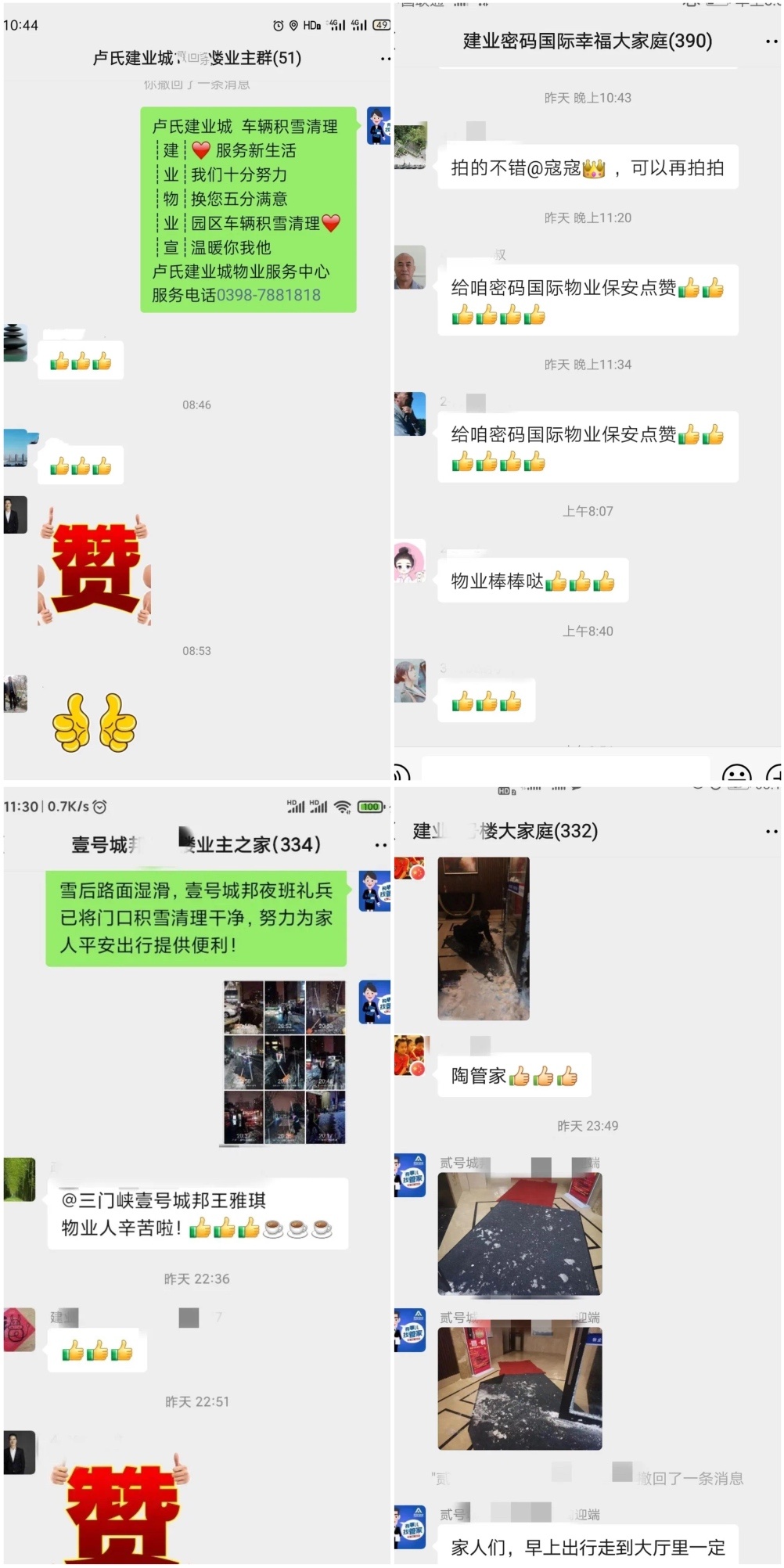 雪落的時(shí)候,不少業(yè)主帶著孩子到樓下玩雪嬉戲,建業(yè)物業(yè)人便守護(hù)在身旁;擔(dān)心業(yè)主夜晚出行,大雪還在下的時(shí)候,建業(yè)物業(yè)人便開(kāi)始清雪,遇到晚歸的業(yè)主,或是俯身清理車(chē)前的積雪或是遞上一把傘;擔(dān)心大雪壓彎樹(shù)枝而破壞業(yè)主車(chē)輛,建業(yè)物業(yè)組建小分隊(duì)清理樹(shù)枝積雪,并且將車(chē)輛雨刮器打開(kāi),進(jìn)行臨時(shí)保護(hù);建業(yè)物業(yè)人清理完道路便幫業(yè)主清理車(chē)輛上的積雪,確保業(yè)主第二天能正常上班出行……