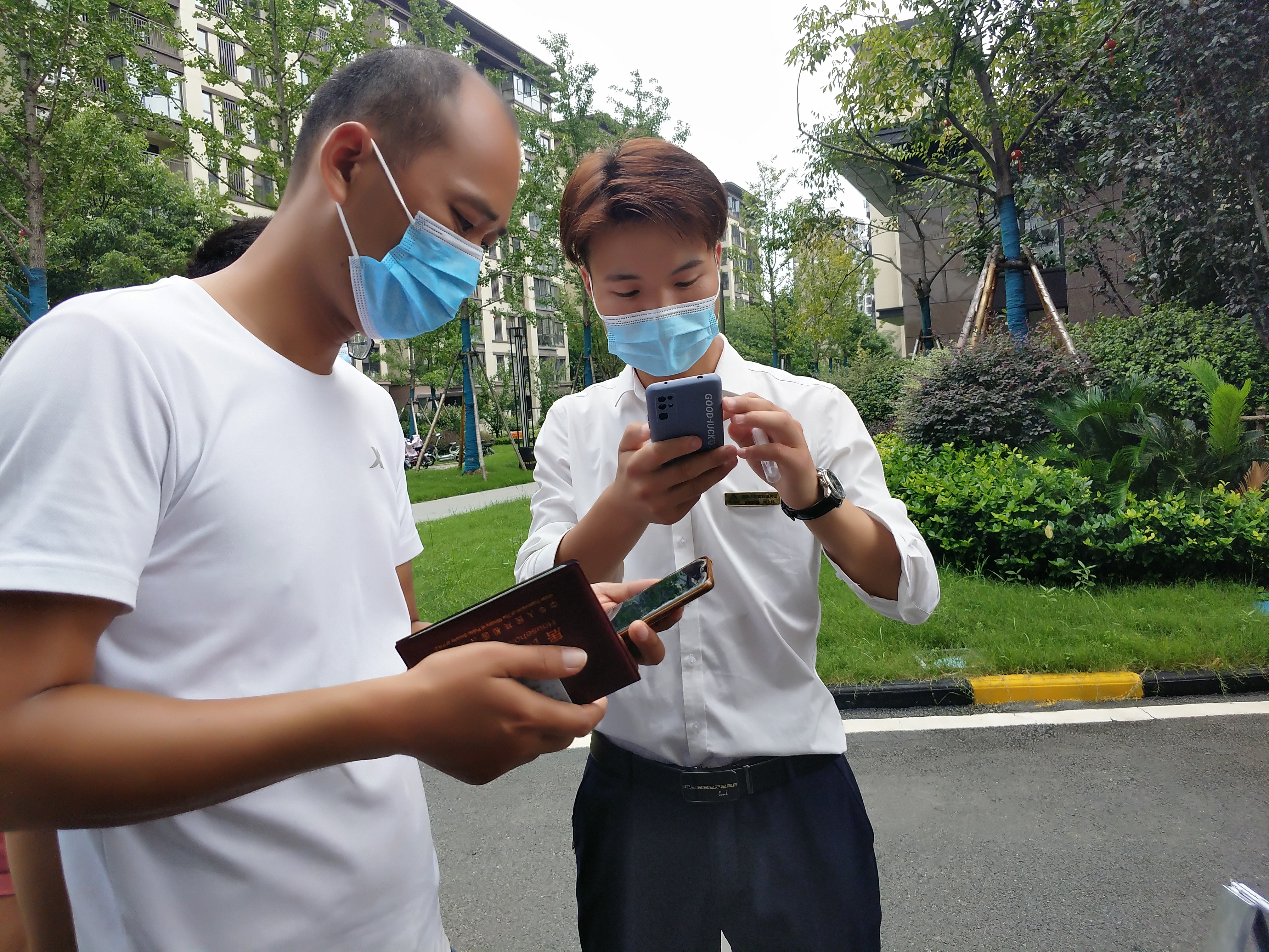 左一為商丘·聯(lián)盟新城管家王帥正在用手機(jī)核對業(yè)主信息