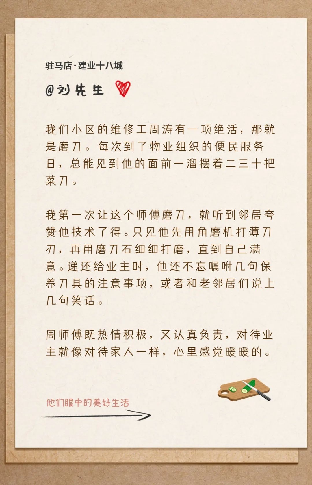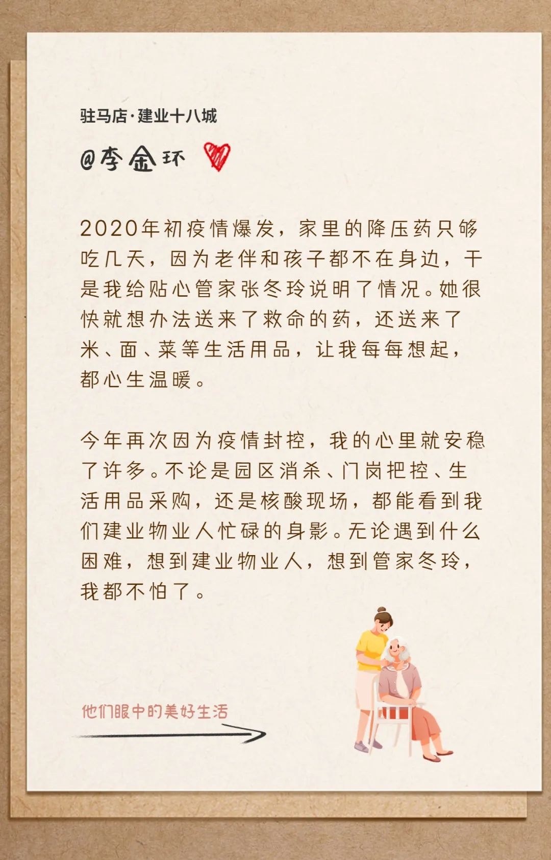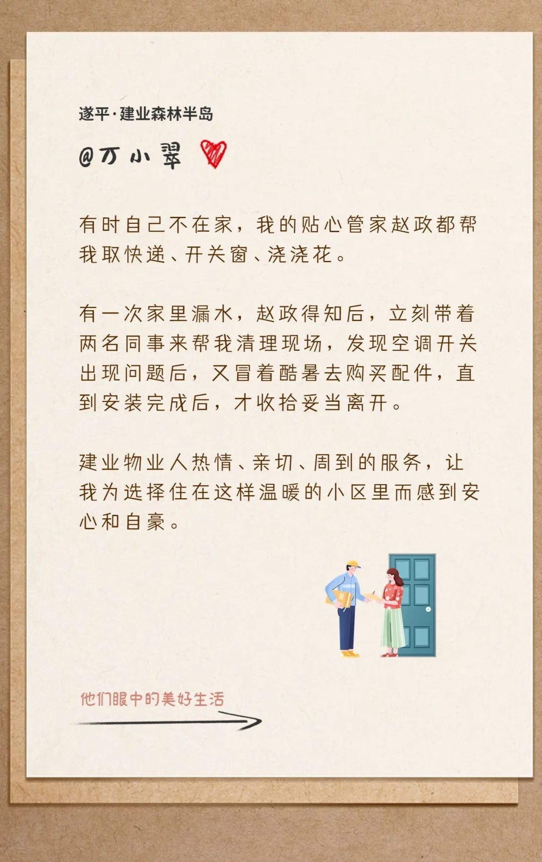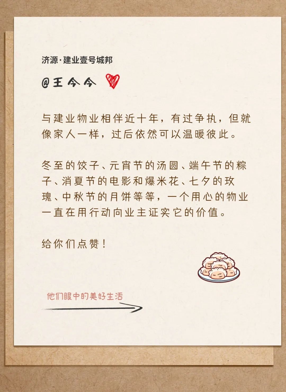 建業(yè)物業(yè)竭力為業(yè)主制造一份份美好,而業(yè)主們也在用真摯懇切的情感和樸實有力的文字,一字一句地記錄著建業(yè)物業(yè)人的付出,表達著自己內(nèi)心的感動和認可。