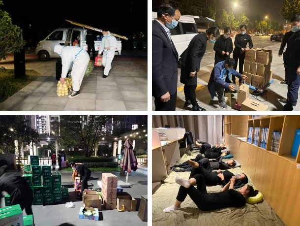 凌晨五點(diǎn)多,在橘黃的路燈下,建業(yè)物業(yè)人已開始布置核酸現(xiàn)場,直到深夜,他們?nèi)栽诖虬诙煲偷奈镔Y。靜默期間吃住在小區(qū)的建業(yè)物業(yè)人,醒來就奔波在園區(qū)里,深夜就席地而睡,他們猶如一簇簇燭火,在黎明到來之前,用微光照亮城市。