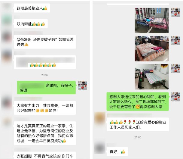 在一次日常溝通中,一名業(yè)主發(fā)現(xiàn)物業(yè)人連打地鋪的被子都少得可憐,便在業(yè)主群里號召大家支援物業(yè)。頓時,業(yè)主群里沸騰起來:“我家車庫里有折疊床,拿走用吧!”“我這兒有個大床墊,被子、枕頭都是干凈的!” “還需要被子嗎?有需要我過去?!薄按蠹矣辛Τ隽?,共度難關(guān),一切都會好起來的!”“這才是真真正正的建業(yè)一家親,為堅守崗位的物業(yè)及所有的熱心好鄰居點贊!”……一句句溫暖的話語,讓物業(yè)人內(nèi)心涌動著一股股暖流。