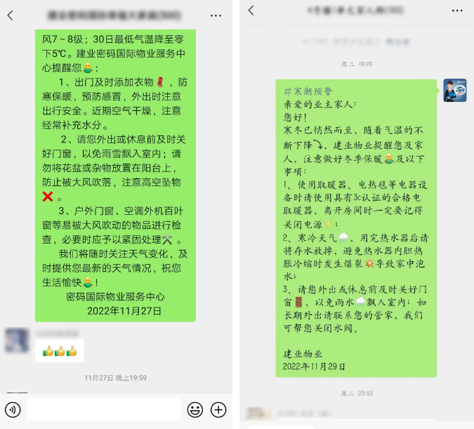 添加衣物、關(guān)好門窗、預(yù)防感冒、冬季養(yǎng)生、安全使用取暖設(shè)備、外出關(guān)閉水管閥門,貼心管家們事無巨細的貼心提醒讓業(yè)主們可以從容迎接寒潮。