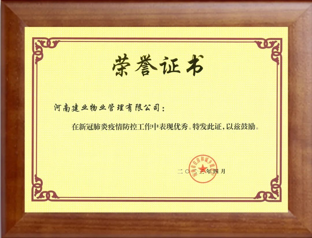 近日,因在過去三年的新冠肺炎疫情防控工作中表現(xiàn)優(yōu)秀且作出突出貢獻(xiàn),建業(yè)物業(yè)獲得由河南省住房和城鄉(xiāng)建設(shè)廳頒發(fā)的榮譽(yù)證書。