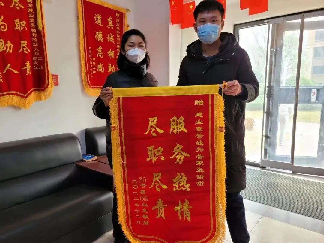 “鼎力相助,有求必應(yīng)” “排憂解難,情系業(yè)主” “服務(wù)熱情,盡職盡責(zé)” …… 12月8日,剛剛解封不久的新鄉(xiāng)·建業(yè)壹號城邦物業(yè)服務(wù)中心內(nèi),業(yè)主代表們將21面鮮紅的錦旗送給了貼心管家張?zhí)鹛?,對她在疫情封控期間的無私奉獻及日常服務(wù)中的盡職盡責(zé)表達感謝。 是她的負責(zé),保障了我們特殊時期的安全 在前段時間的疫情管控中,張?zhí)鹛鹚撠?zé)的樓棟內(nèi)出現(xiàn)了確診病例,按照當時的政策,需要對整個單元進行封控,張?zhí)鹛鸨愠袚?dān)起整個樓層的消殺、物資配送等工作。在配送物資時,張?zhí)鹛鸢l(fā)現(xiàn)有的業(yè)主并沒有按照防疫要求足不出戶,便主動勸導(dǎo)業(yè)主進行嚴格的居家隔離,避免病毒進一步擴散。 與此同時,張?zhí)鹛疬€時刻關(guān)注著被感染業(yè)主的健康情況,在被感染